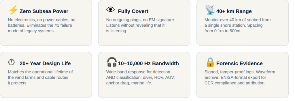 And because there are no wet-end electronics to fail or maintain, the system is designed for a service life of more than 20 years, matching the operational lifetime of the offshore wind farms, pipelines, and cable routes it is built to protect.