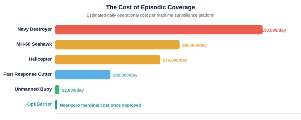 In practical terms, OptiBarrier works alongside the USVs, AUVs, and patrol assets that navies and operators are already deploying. Those mobile platforms are the response layer. OptiBarrier is the sensing layer that tells them where to go. The persistent tripwire that cues the dynamic response.