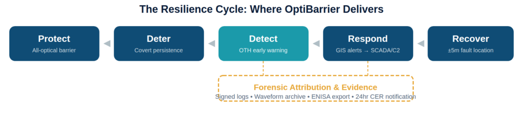 The same OptiBarrier array that protects an offshore wind farm’s export cable for CER compliance simultaneously provides acoustic surveillance data that feeds national defence situational awareness. The investment in commercial compliance becomes the foundation for a public-private partnership where defence agencies co-invest in shared capability.