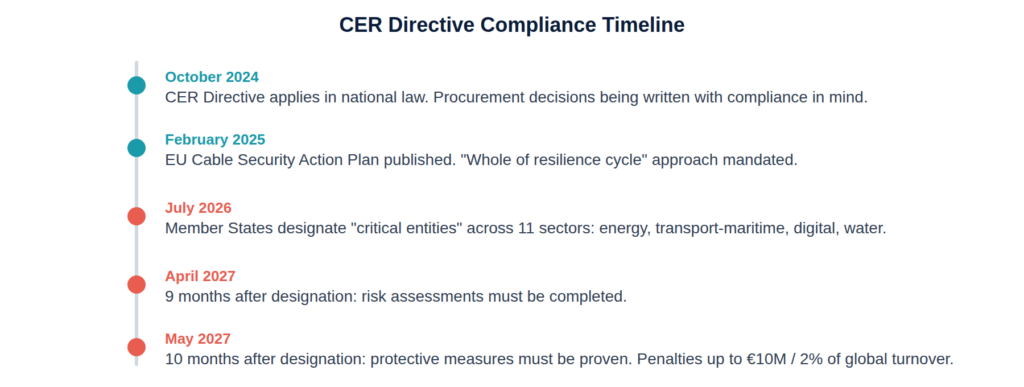 The CER Directive creates a compliance timeline that infrastructure operators cannot afford to ignore. Given that procurement cycles for subsea systems run 12 to 18 months, operators who begin planning after designation will already be behind.